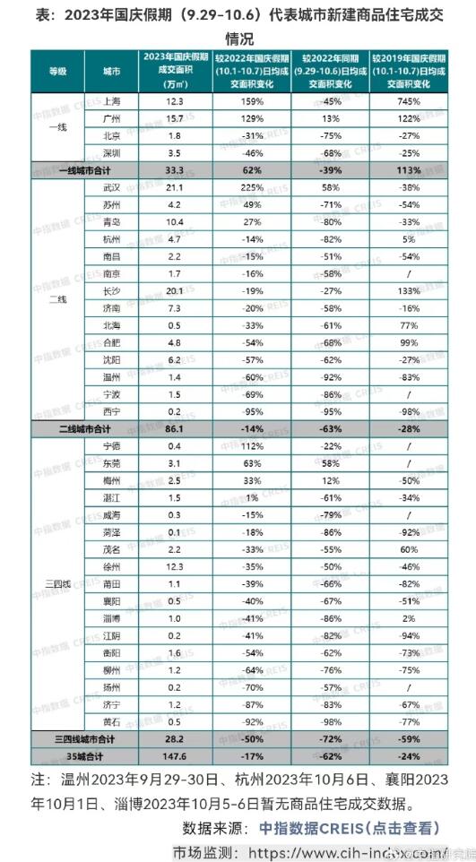 根据中指数据,2023年国庆假期期间(9月29日-10月6日),35个代表城市日均成交面积较去年国庆假期(10月1日-7日)及2019年假期下降两成左右。