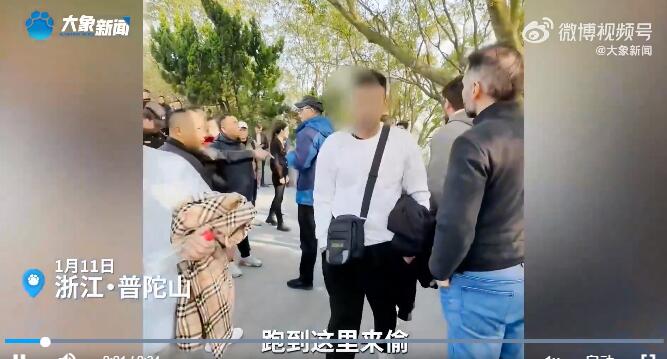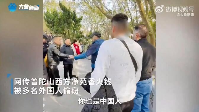 【曝多名外国人偷窃普陀山香火钱】1月11日,网传浙江舟山普陀山西方净苑香火钱被多名外国人偷窃。视频显示,周围民众群情激愤,与导游发生争吵,有人愤怒地说:“就是小偷。”