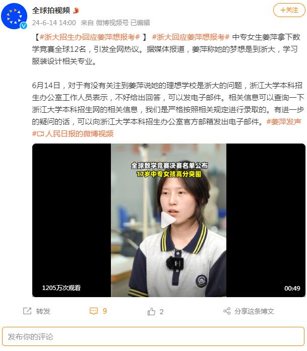 【#浙大招生办回应姜萍想报考# 】 #浙大回应姜萍想报考# 中专女生姜萍拿下数学竞赛全球12名,引发全网热议。据媒体报道,姜萍称她的梦想是到浙大,学习服装设计相关专业。