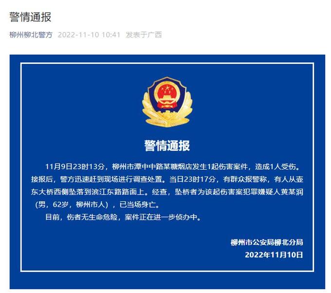 11月10日,据柳州柳北警方通报:11月9日23时13分,柳州市潭中中路某糖烟店发生1起伤害案件,造成1人受伤。接报后,警方迅速赶到现场进行调查处置。当日23时17分,有群众报警称,有人从壶东大桥西侧坠落到滨江东路路面上。经查,坠桥者为该起伤害案犯罪嫌疑人黄某润(男,62岁,柳州市人),已当场身亡。