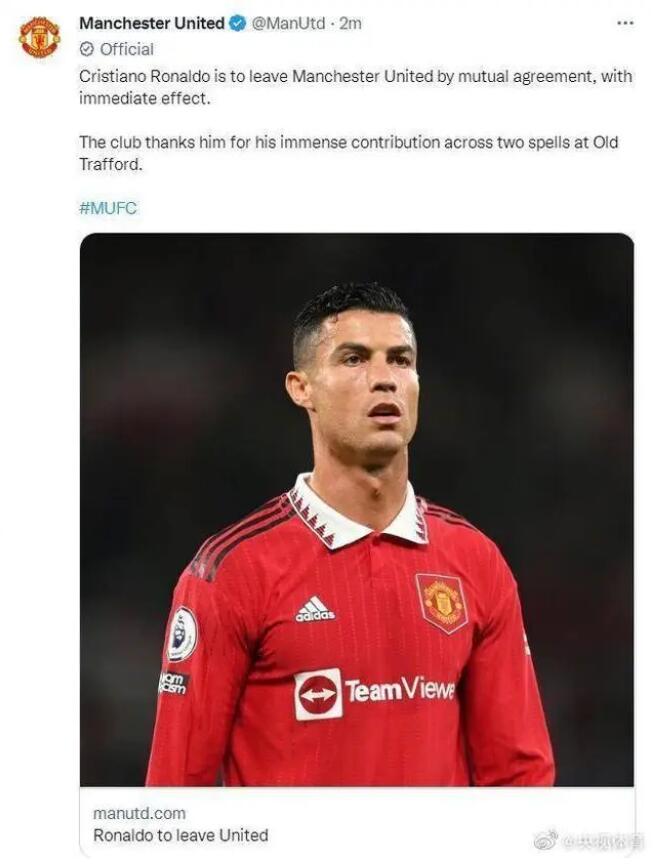【曼联官方宣布C罗离队】北京时间11月23日凌晨,曼联官方宣布,C罗离队,立即生效!