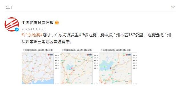 【广东河源4.3级地震 广州深圳有震感】中新网2月11日电 据国家地震台网官方微博消息,中国地震台网正式测定:2月11日10时41分在广东河源市源城区(北纬23.76度,东经114.64度)发生4.3级地震,震源深度11千米。震中距广州市区157公里,地震造成广州、深圳等珠三角地区普遍有感。