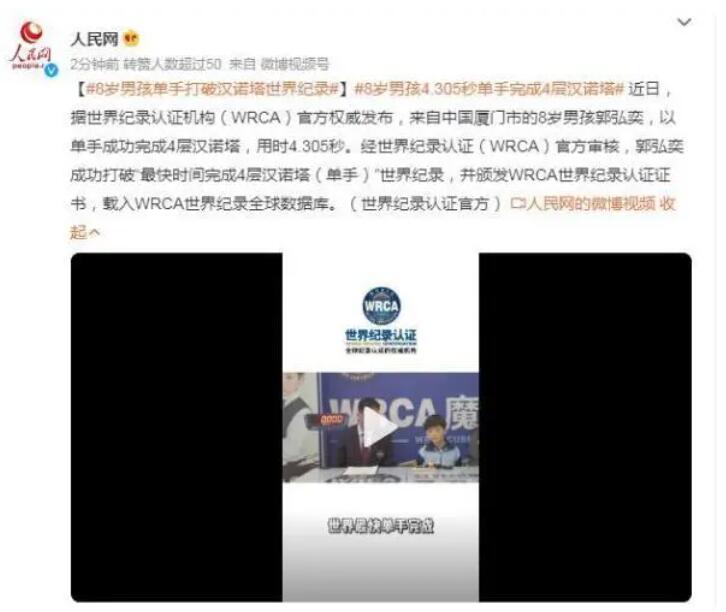 【8岁男孩单手打破汉诺塔世界纪录】近日,据世界纪录认证机构(WRCA)官方权威发布,来自中国厦门市的8岁男孩郭弘奕,以单手成功完成4层汉诺塔,用时4.305秒。经世界纪录认证(WRCA)官方审核,郭弘奕成功打破“最快时间完成4层汉诺塔(单手)”世界纪录,并颁发WRCA世界纪录认证证书,载入WRCA世界纪录全球数据库。