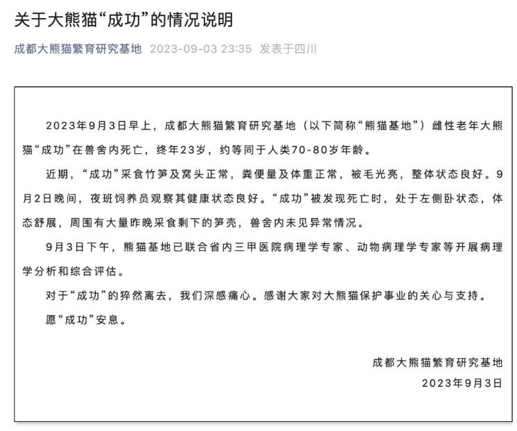 2023年9月3日早上,成都大熊猫繁育研究基地(以下简称“熊猫基地”)雌性老年大熊猫“成功”在兽舍内死亡,终年23岁,约等同于人类70-80岁年龄。
