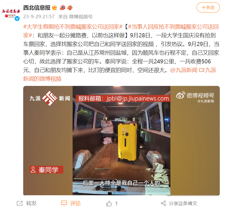 9月29日,当事人秦同学表示,自己是从江苏常州回盐城,因为抢不到高铁票,想搭顺风车也因坐满员没挤上,自己又回家心切,无奈之下只能选择货拉拉搬家公司的车。